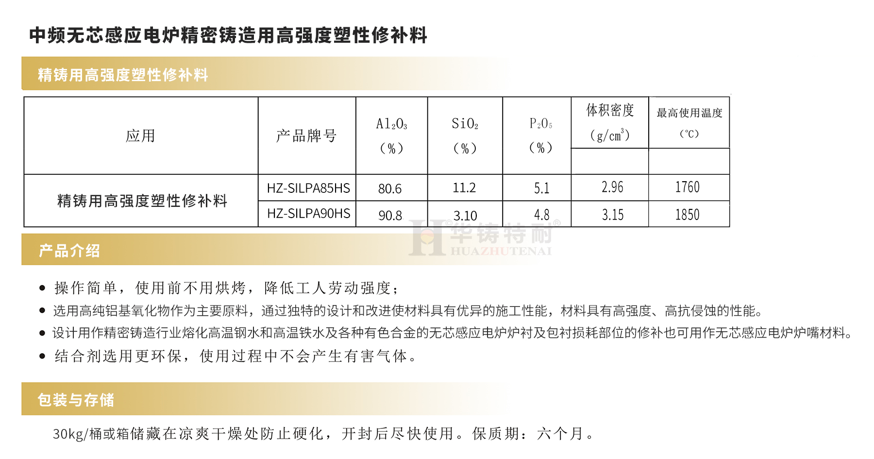 【產(chǎn)品介紹】:中頻無(wú)芯感應(yīng)電爐精密鑄造用高強(qiáng)度塑性修補(bǔ)料