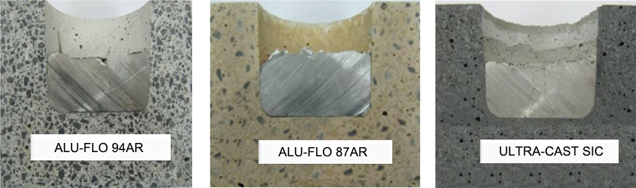 中鑄耐火®生產(chǎn)用于鋁加工工業(yè)高溫設(shè)備的全套耐火材料, 產(chǎn)品應(yīng)用領(lǐng)域涵蓋了鋁加工工業(yè)所有與鋁液相關(guān)的高溫設(shè)備。如鋁合金熔煉保溫爐、鋁水流槽、過濾箱、除氣箱和鋁水包等。 其中多個產(chǎn)品具有非常創(chuàng)新性的材料設(shè)計和使用效能。推薦所有與鋁水接觸的部位使用中鑄耐火含有復(fù)合抗粘劑的低水泥澆注料作為工作爐襯。 我們對所有與鋁水接觸部位材料都進行了鋁水坩堝侵蝕實驗,通過嚴格的測試選擇最佳的材料結(jié)構(gòu)設(shè)計和獨特的復(fù)合抗粘鋁抗粘劑,材料在950℃以內(nèi)具有很好的抗鋁水滲透性能(見下圖),在1200 ℃以內(nèi)仍然具有一定的抗粘鋁性能。